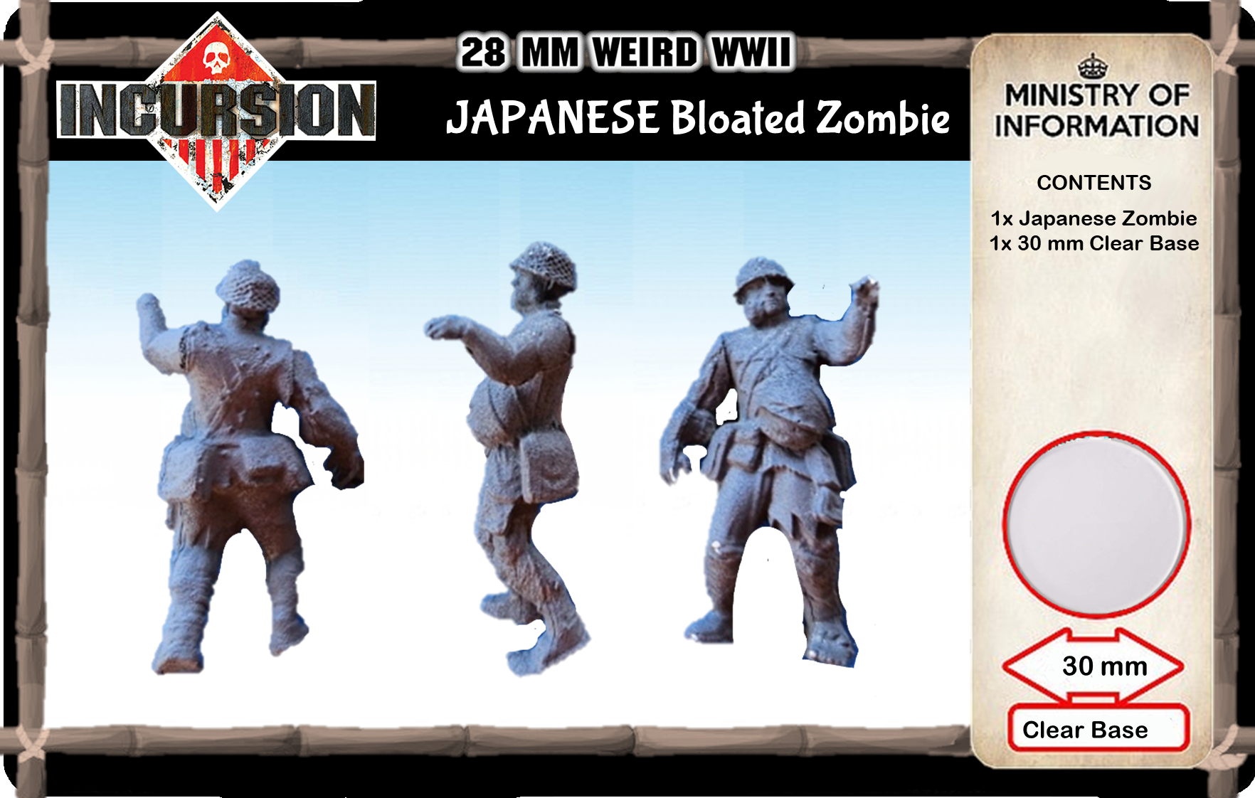 The terror unleashed by the arcane in the East, from China to now Iwo Jima, the reanimated corpses. When the zombies have been festering in the heat of the pacific, stuck in the water, they come out bloated. Contains 1 unpainted model and 40 mm clear plastic base.