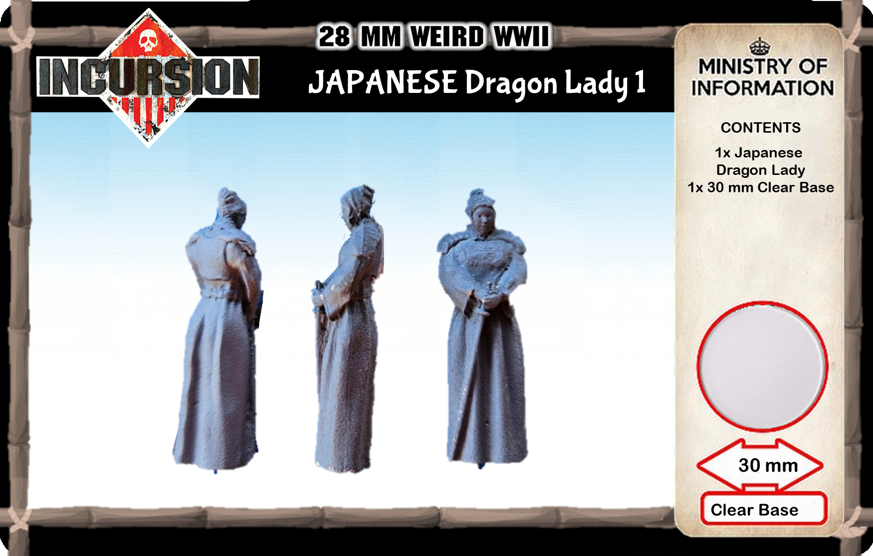 The terror unleashed by the arcane in the East, from China to now Iwo Jima, the reanimated corpses, the Oni, what is causing this. The mistresses of darkness, the dragon ladies. When the zombies have been rising and obeying, Oni have appeared, it means the Dragon Lady is near. Contains 1 unpainted model and 30 mm clear plastic base.