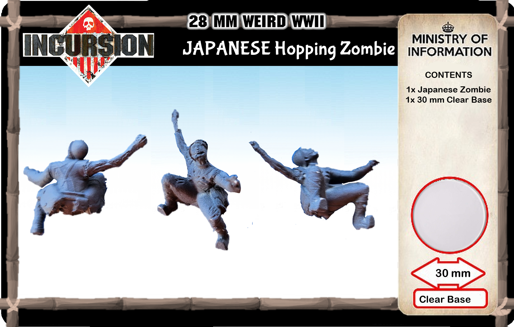 The terror unleashed by the arcane in the East, from China to now Iwo Jima, the reanimated corpses. Contains 1 unpainted model and 30 mm clear plastic base.