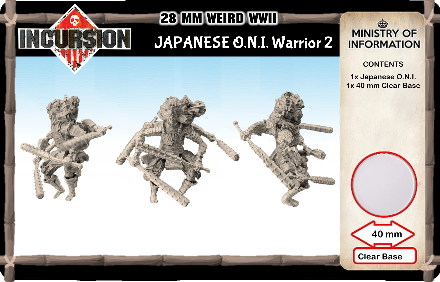 The research being conducted by Japan in 1949 not only includes the occult, demons, spirits, the oni but part of the Project O.N.I. Gurupu program is to develop alternatives, O.N.I. are one such alternative. Contains 1 unpainted model and 40 mm clear plastic base.