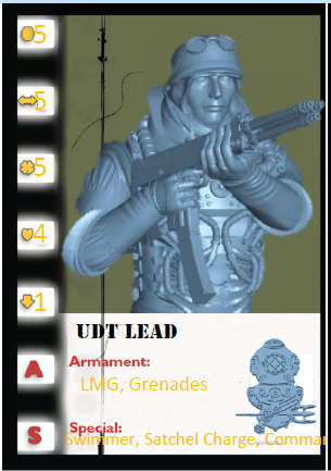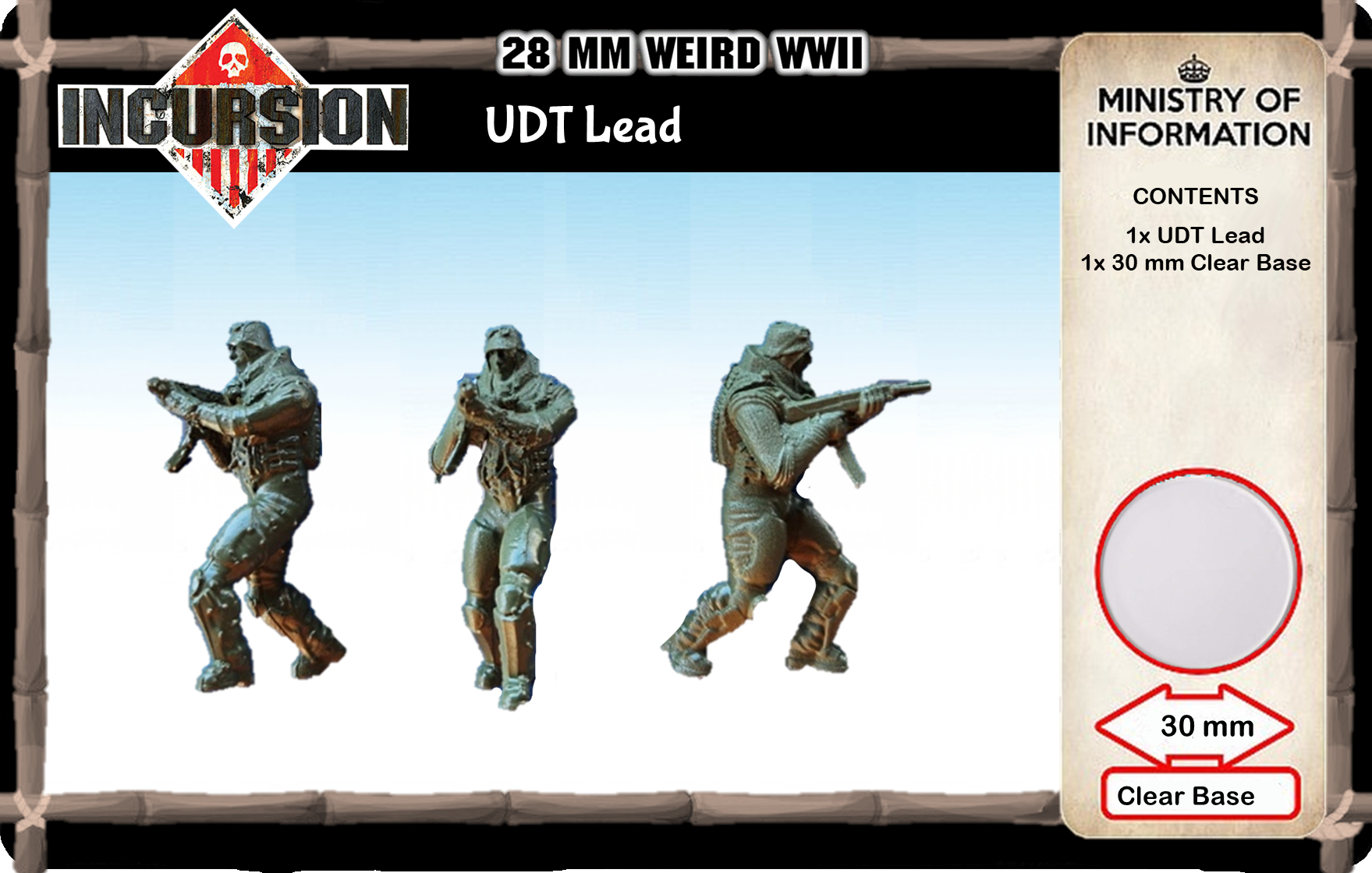 The UDT, using advanced alien adaptive camouflage technology, lead the assaults in the Pacific for the USMC. Typically a Lead has the most experience, skills and slides into Command when needed most, not just by rank. Contains 1 unpainted model and 30 mm clear plastic base.