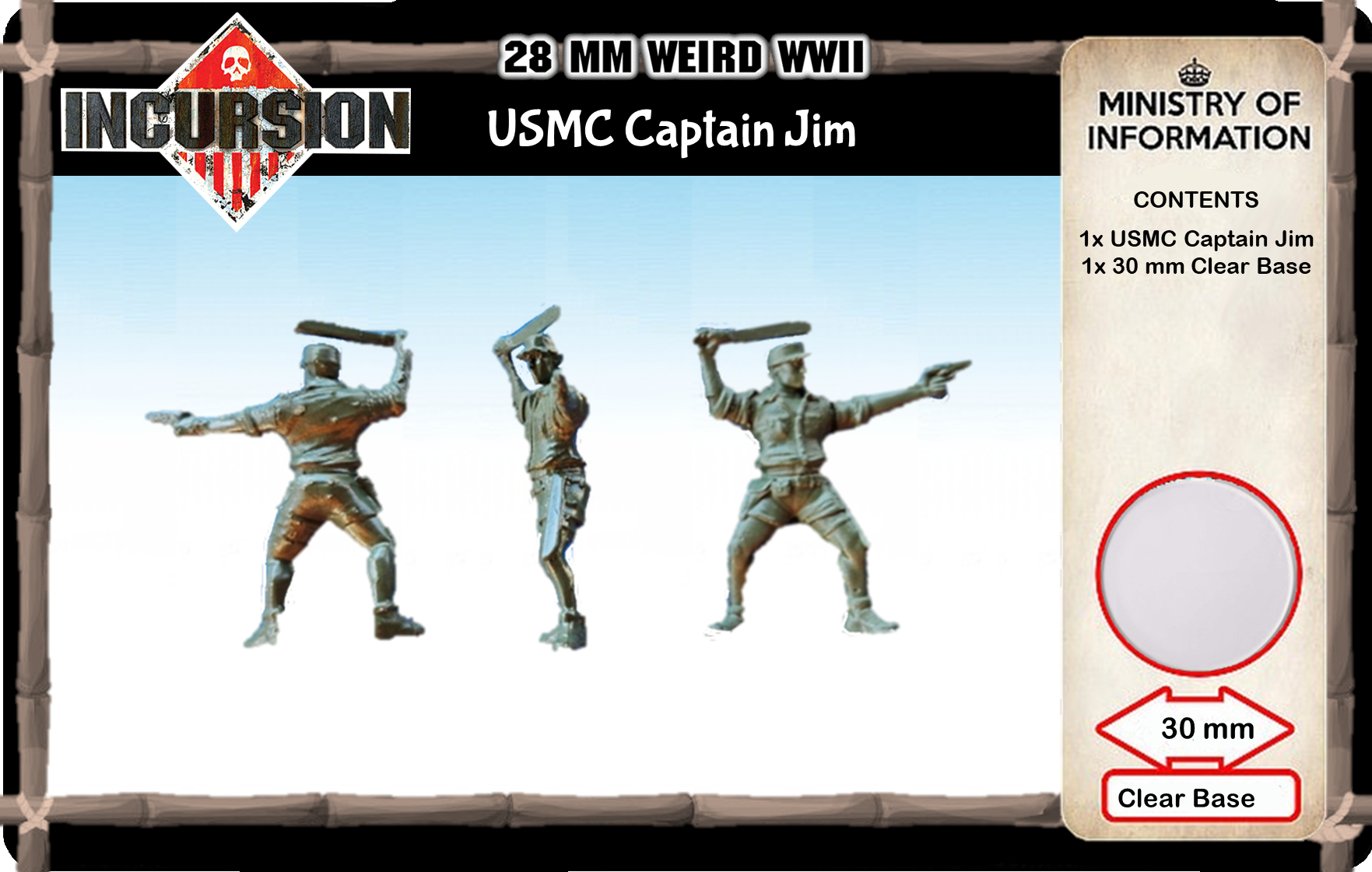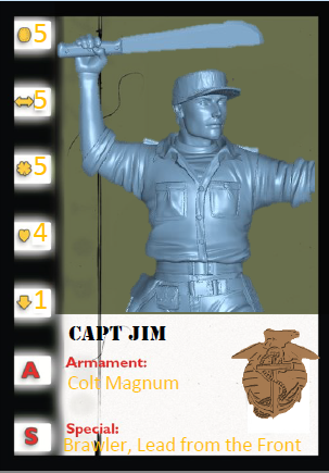 The man, the myth, the legend, who started it all! Trained and fighting Marine, helped turn the UDT 13th Grinders into an assault force that proceeds the amphibious attacks by his Marines… look out Japanese, zombies, slackers, Capt Jim is here to take command! Contains 1 unpainted model and 30 mm clear plastic base.