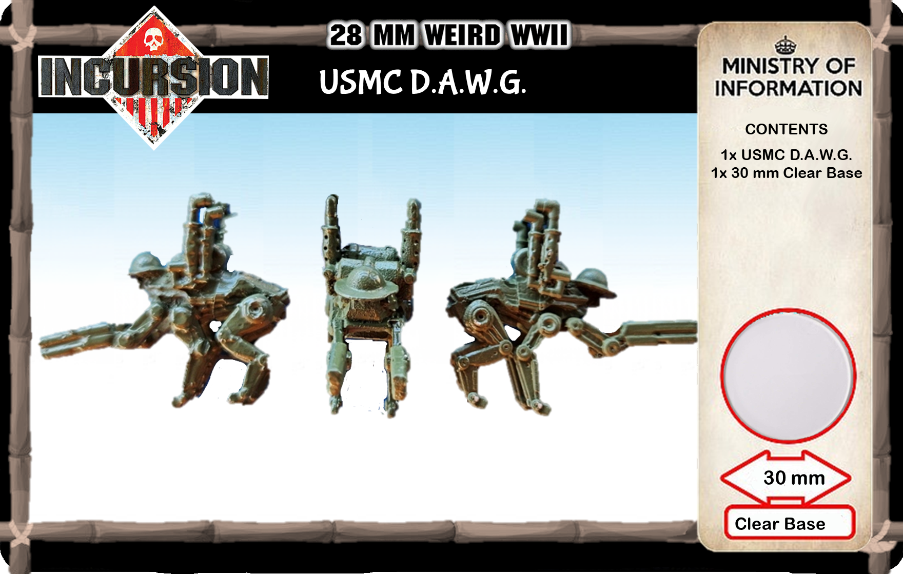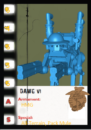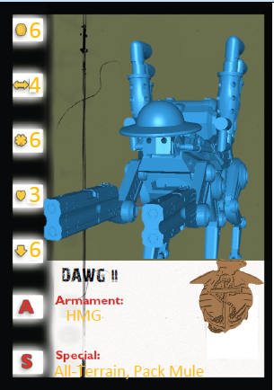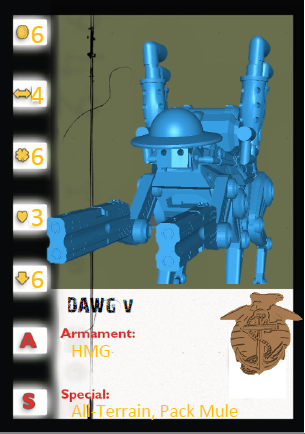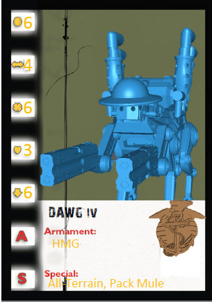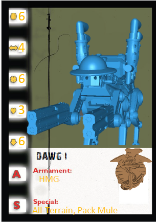 When you need to carry supplies a long distance, or need to send in your buddy, call for your pal, the 4 legged, well and 2 0.50 cal double barrelled derringer buddy D.A.W.G. A robotic mule that has 4 barrels of kick! Contains 1 unpainted model and 30 mm clear plastic base.